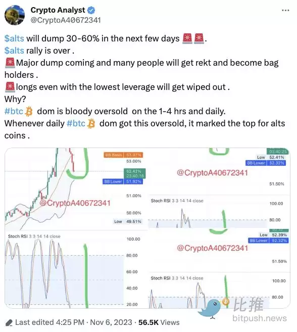 这位分析师警告说,“未来几天”山寨币市场可能会下跌30%到60%。他指出,当比特币的主导地位变得超卖时,通常预示着山寨币市场已经见顶。