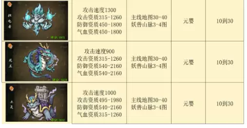 二、宠物地图产出表(仅供参考),目前游戏内主要汇总了妖兽、魂兽及灵兽的分布情况。