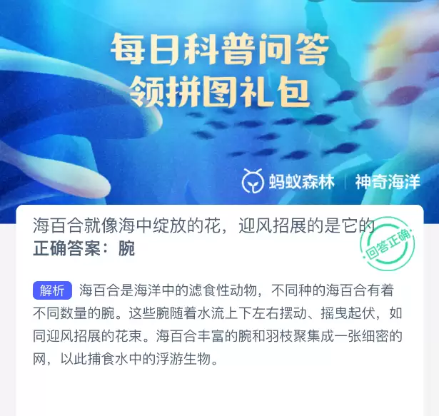 海百合宛如在海洋中绽放的花朵,那些在流水中摇曳生姿的结构是它的什么部位?【神奇海洋】11月7日的新题目现已揭晓,正确答案已经公布。快来点击领取拼图,和我们一起为海洋生态的修复贡献力量吧!经过今天的答题活动,我们得知正确答案是:【腕】。海百合作为海洋中的滤食性动物,不同种类拥有数量不等的腕。这些腕会随着水流上下左右摆动、摇曳起伏,就像迎风招展的花束一般。