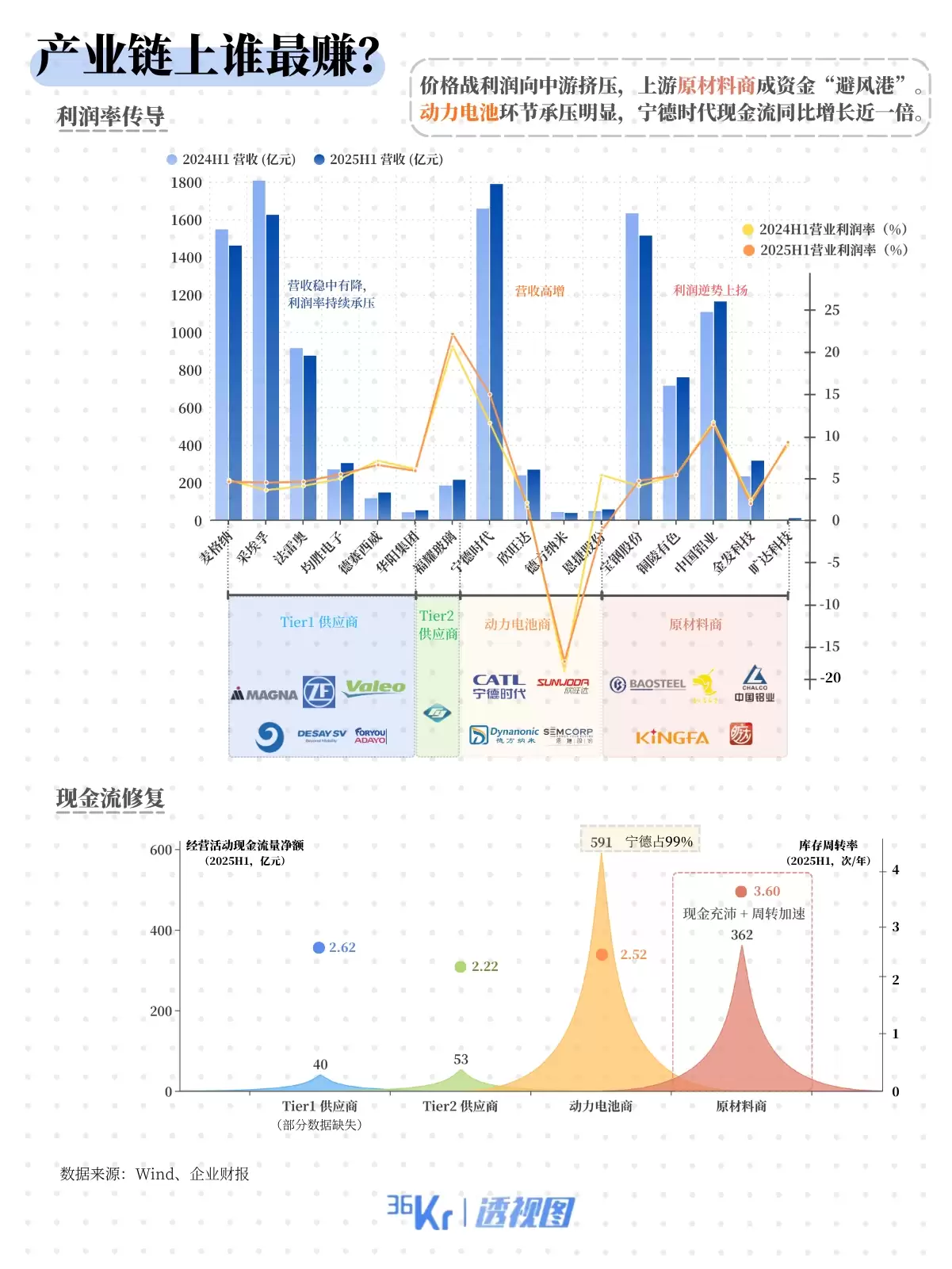 宝钢、中铝等原材料厂商稳步增长,资金储备充足;宁德时代等动力电池核心制造商增长显著,但正极材料、隔膜等原材料供应商仍处于亏损状态。传统动力和底盘类Tier 1企业营收与利润双双下滑,多家巨头已启动全球范围内的多轮裁员。