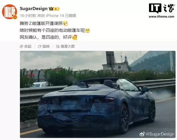 近日,设计博主@SugarDesign在社交平台上曝光了一组比亚迪腾势Z敞篷跑车的实车谍照,随即在网络上掀起热议。这组照片生动呈现了车辆在敞篷状态下的独特姿态,根据网友确认,这款敞篷跑车采用了四门四座的设计布局。