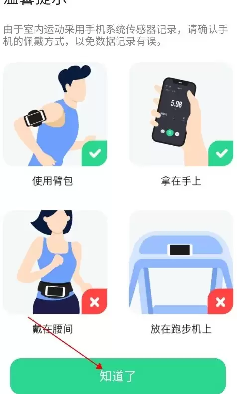 开始训练前会出现操作提示,请务必按照要求正确佩戴手机,轻触确认键即可进入准备状态