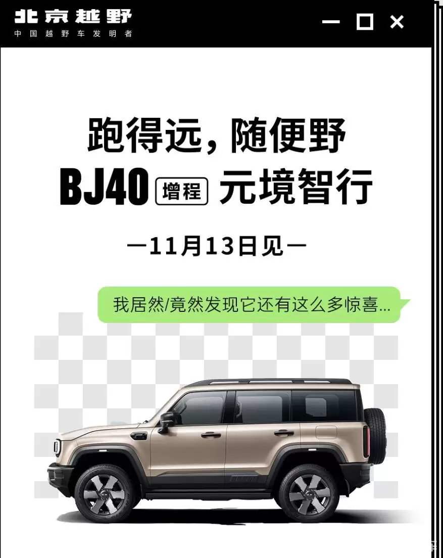 北京越野BJ40增程元境智行版计划于11月13日正式上市,最新微博已发布相关消息。这款新车在智能配置方面或将有显著提升,预计会对智能辅助驾驶系统进行升级优化。与此同时,新车还将配备11种智电ATS全路况模式,进一步增强车辆的适应能力。外观设计上,新车延续了方正硬朗的风格,前脸采用矩形熏黑格栅,搭配环形大灯和加粗的银色保险杠,展现出典型的中式“硬汉”气质。新车可能会在配置方面进行优化调整,以提升整体竞争力。