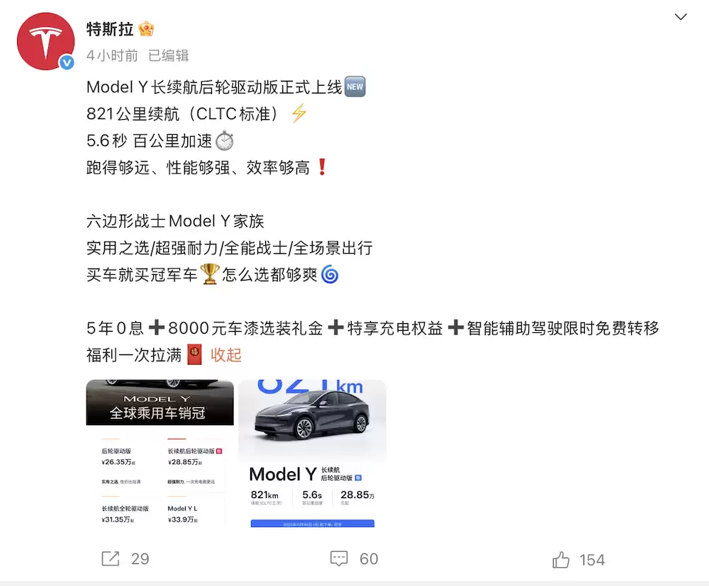 特斯拉Model Y长续航版上市:78.4kWh电池续航达821公里