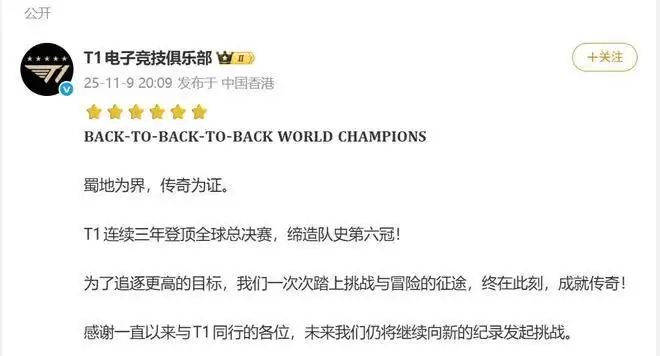 T1电竞战队斩获S15总冠军,11月9日荣耀加冕
