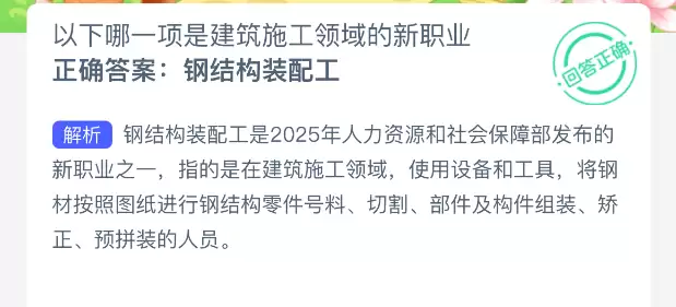 在建筑施工作业中,哪个选项是近年兴起的全新职业?【蚂蚁新村每日一题】2025年11月9日的题目现已公布!只要坚持参与答题,积累木兰币,就能加速建设你心仪的小镇。回答正确本题,即可立刻获得“产速+3/时”的限时加速奖励!今天正确答案是【钢结构装配工】。钢结构装配工指的是在建筑工程施工现场,借助各类设备与工具,依据设计图纸对钢材进行结构零部件号料、切割、构件及部件组装、矫正、预拼装的专业技术人员。