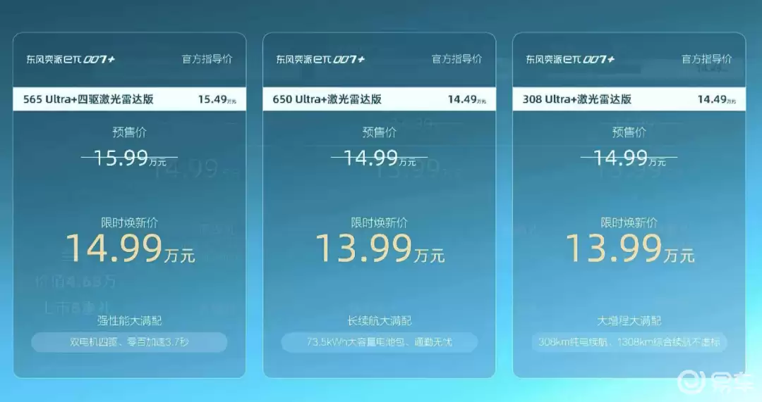 东风奕派近日推出全新中大型智能轿车eπ007+,以“全系标配激光雷达+高性能骁龙8295P芯片”为核心技术优势,同步推出增程版与纯电动版共3款配置车型,限时钜惠价13.99万元起。这款被业内视为冲击15万元级新能源市场的战略车型,通过“入门即高配”的产品策略,直接对标长安启源A07、风行星海S7等同级竞品,试图在细分领域建立技术壁垒。