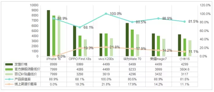 百亿补贴渠道的价格竞争更为激烈。拼多多成为8款产品最低价出现最频繁的平台,其中vivo X200s与华为Mate 70价差达1100-1200元,OPPO Find X8s价差约1000元。分平台表现看,抖音超额购渠道vivo X200s价差达1000元;京东百亿补贴中iPhone 16价差200元;拼多多渠道OPPO Find X8s价差200元;天猫百亿补贴中小米15价差300元。值得注意的是,iPhone 17系列未参与任何平台的补贴活动。