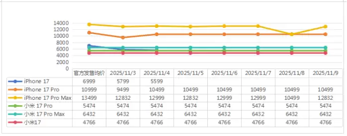 在9月新上市产品中,iPhone 17系列在京东最新旗舰店出现明显价格调整,Pro Max与Pro机型较最新发布价均下调300元,导致整体均价下滑。相比之下,该系列其他机型价格保持稳定,与发售价持平。而在百亿补贴渠道,拼多多平台表现突出,iPhone 17系列不同机型出现200-500元不等的优惠,且上架时间不固定导致均价波动较大。同期监测的小米17系列在百亿补贴活动中价格相对平稳,未出现大幅变动。