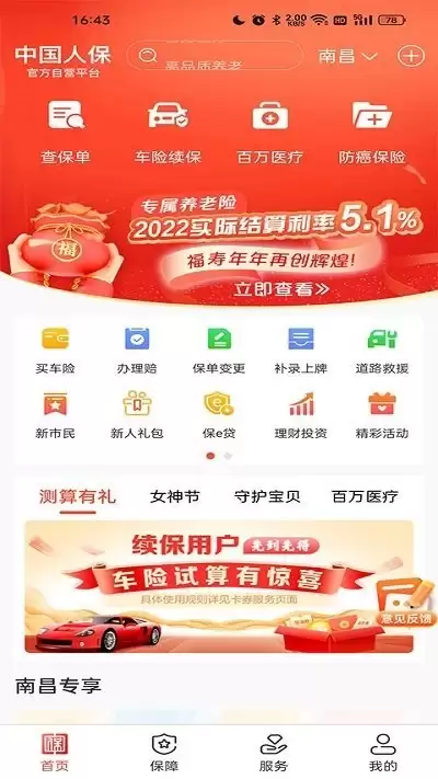1、首页导航:用户可轻松实现保单查询、百万医疗产品购买、车险续保、防癌保险选购等常用功能入口,服务覆盖全面。