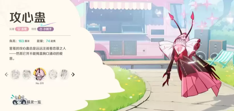 攻心萤这个精灵目前的设计原理较为特殊。拥有“喜爱原理”这一类机制的精灵并不常见。它在游戏中身高出众,达到163cm,但所需的能量消耗也比较大,需要74点能量才能启用。游戏中,喜爱原理能够基于自身的基础数值,带来额外的生命值上限提升,并且开局就能制造一件“爱之戒”。这件爱之戒只有具备喜爱原理的精灵才能装备;尤其是喜爱类型的精灵释放主动技能后,能为爱之戒叠满足够的“恋心状态”。