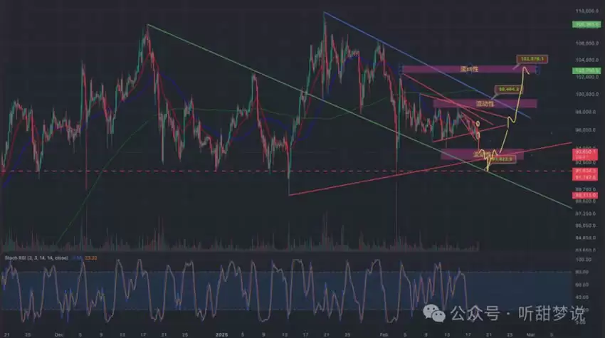 我认为接下来可能会有一波小幅反弹,但整体趋势仍然偏向下行。短线操作上,我预计可能会出现一根较长的“针”,甚至可能触及91.8K附近。这个位置是大周期支撑位附近,同时也是一条绿色趋势线的位置。这样的下跌可以击穿下方的红色趋势线,迫使一些投资者离场,然后再拉升价格。