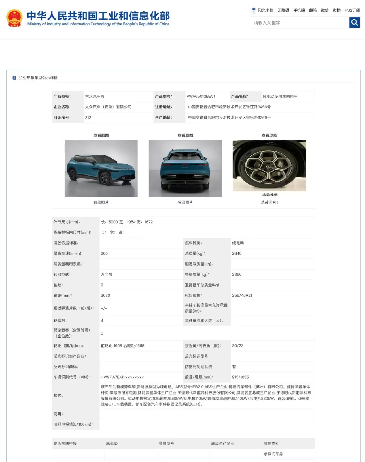 安徽大众第三款车型现身申报,长续航快充智能配置成亮点