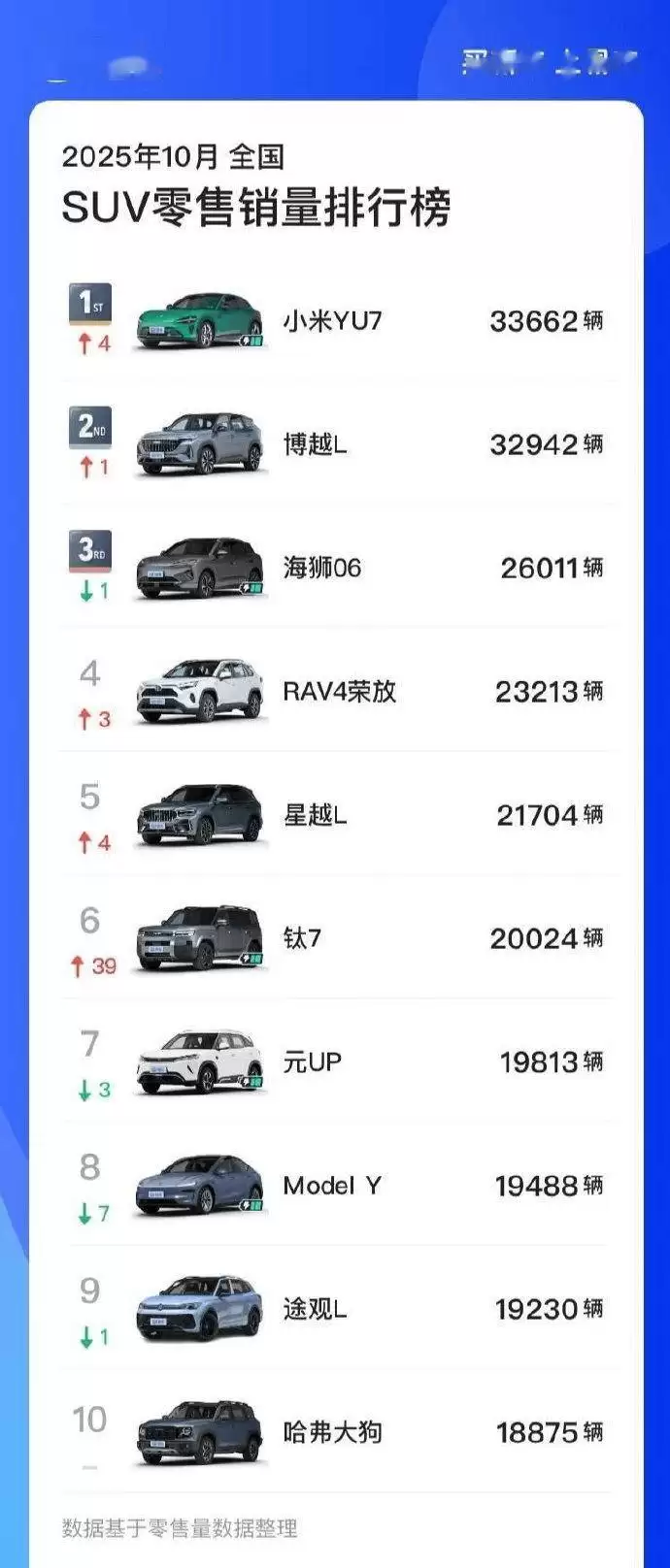 汽车市场近日传来一则令人瞩目的消息:根据易车发布的"2025年10月全国SUV零售销量排行榜"显示,小米YU7凭借33,662辆的月销成绩强势登顶,超越博越L、海狮06等热门车型,成功摘得SUV销量桂冠。