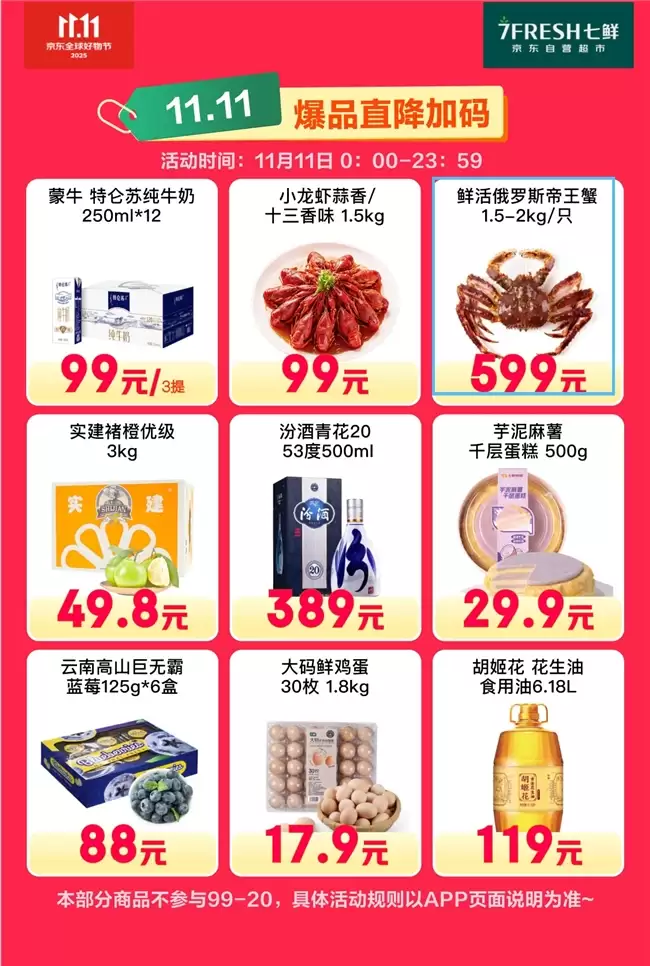 京东七鲜99减20福利:11.11终极优惠今日开启
