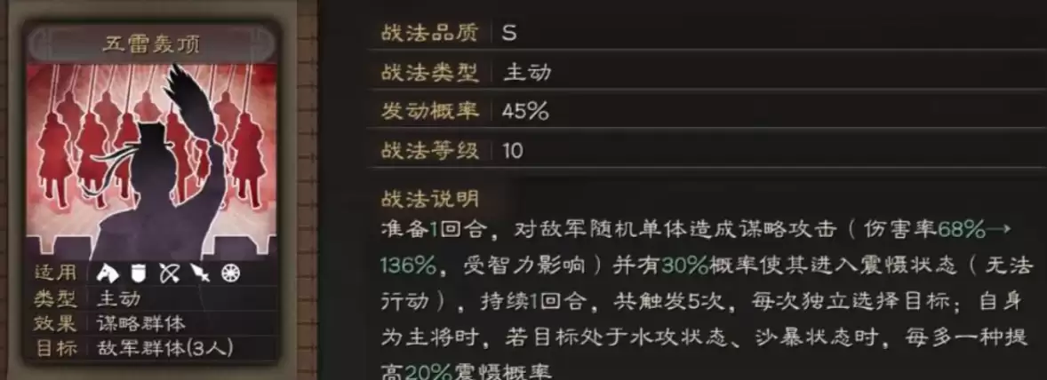 于吉的核心战法"兴云布雨"是他在游戏中立足的关键技能。此战法可使敌方全员陷入"水攻"状态,造成持续的法术伤害。该技能除了提供稳定的群体输出外,更重要的是自带的控制效果,为队友创造了绝佳的输出环境。特别是当于吉与张角同时上场时,可以形成控场与连锁爆发的强力组合——张角用雷系战法造成持续伤害,于吉则给予敌人稳定的水攻状态,使对手更容易陷入震慑与连锁反应之中。