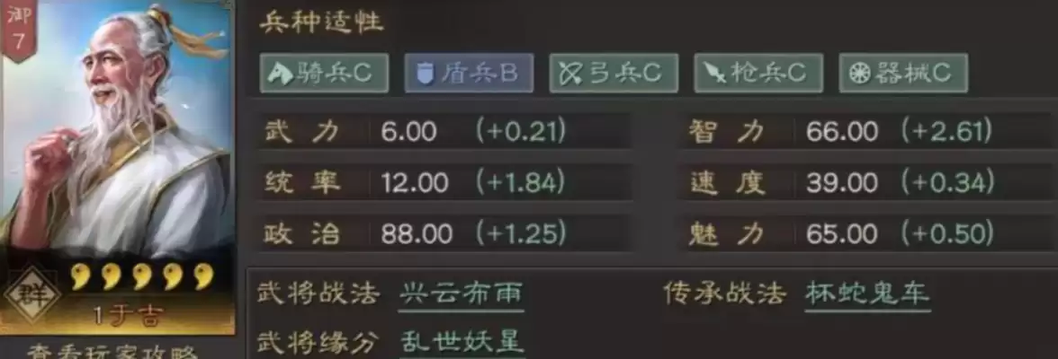 从属性面板来看,于吉的武力值偏低,难以承担高爆发输出的任务;智力属性尚可,但面对顶级谋士时还是有些吃力。不过于吉的统率成长值达到了1.84,这是他数据中最亮眼的部分,让他在生存和控制方面都比较稳定。而且他还拥有30%的"仙人"属性,这个标签使得他在兵种选择上没有限制,几乎可以适应所有的兵种,进而在战场上具备很强的应变能力。