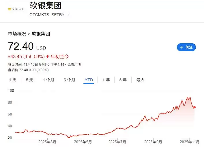 不过,软银股价在过去一周大幅下挫,市值蒸发近500亿美元,创下自2020年3月以来最差单周表现。全球市场对AI泡沫的担忧是此轮抛售的主要驱动因素。不过今年以来,软银股价累计涨幅仍超过150%。