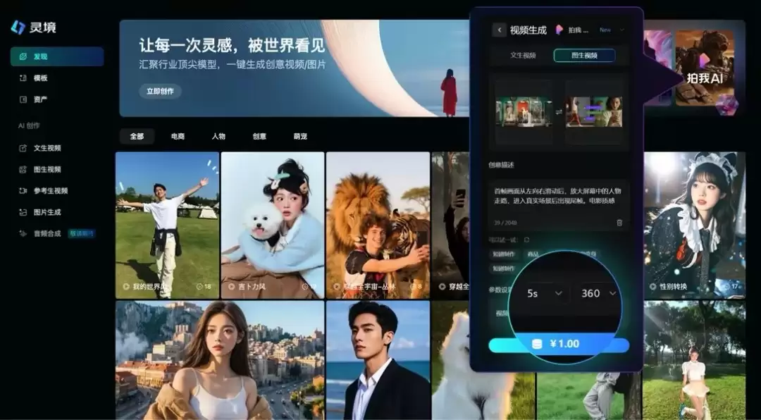 借助灵境创作中心,商家可以利用拍我AI的文生视频和图生视频功能快速制作营销内容。在图生视频模式下,用户只需上传首尾帧画面并输入简单提示词,即可在5-10秒内生成适用于促销场景的短视频,覆盖商品种草、口播素材、导购视频等多种类型。该服务支持生成360P分辨率的5秒视频,成本低至1元,并且可快速应用于短视频平台、商品头图、详情页及广告投放。