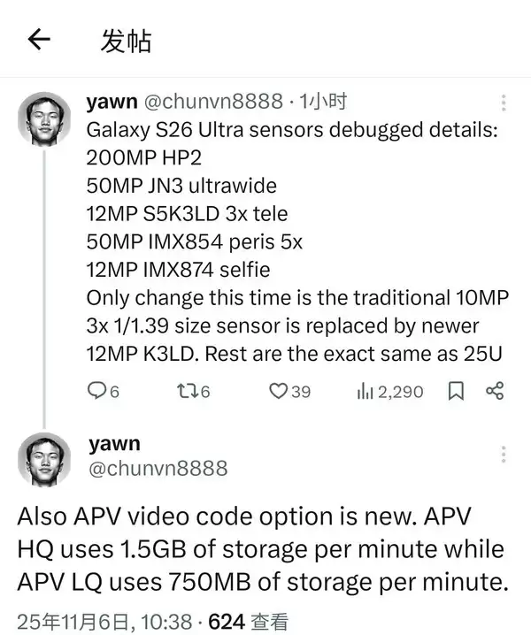 影像配置方面,Galaxy S26 Ultra将延续前代的多摄组合方案,但具体参数迎来全面革新。主摄采用2亿像素传感器,配备5000万像素超广角镜头和双长焦镜头组合,其中一颗长焦镜头像素从1000万提升至1200万,另一颗潜望式长焦镜头保持5000万像素规格。前置自拍镜头采用1200万像素传感器,满足高清视频通话需求。值得注意的是,该机在视频处理能力上引入全新APV编解码技术,通过优化算法实现拍摄画质的显著提升,为用户提供更专业的视频创作支持。