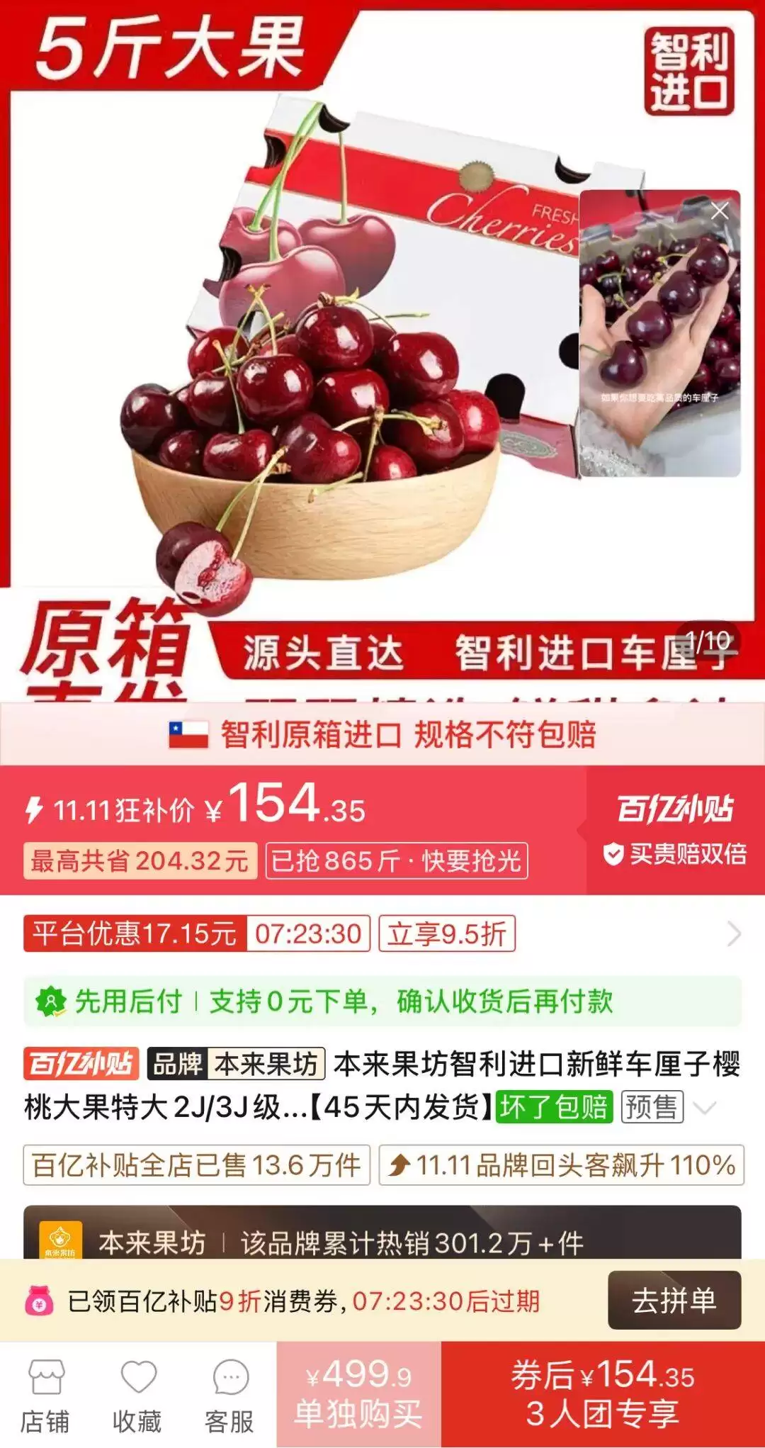 为确保车厘子的品质,拼多多与多个高质量生鲜品牌展开深度合作,深入智利产地,从源头把控车厘子的品质。目前,拼多多百亿补贴频道已上线"智利原箱进口"标识,让消费者能够更加放心地购买。在平台的大力补贴下,5斤智利原箱车厘子的价格更是低至154.3元,引发了消费者的抢购热潮。