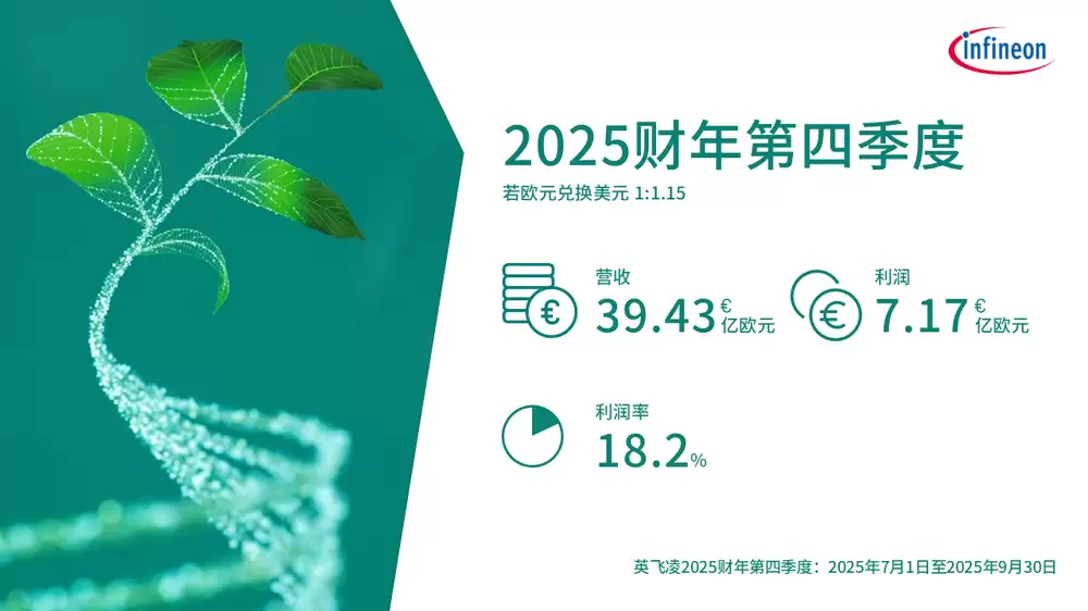 11月13日,英飞凌科技股份有限公司发布了2025财年第四季度及全年业绩报告(数据统计截至2025年9月30日)。2025财年第四季度,公司营收达39.43亿欧元,实现利润7.17亿欧元,利润率保持在18.2%的稳健水平。