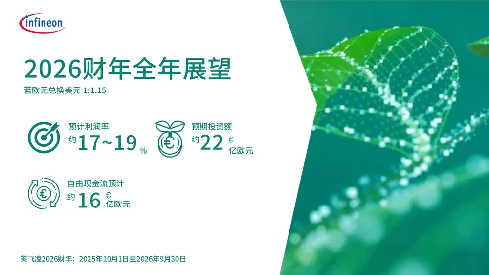 展望2026财年整体表现,虽然汇率波动可能带来不利影响,但英飞凌预计营收将较上一财年实现温和增长。经调整后的毛利率预计在41%至43%之间,利润率有望达到17%至19%。公司计划投入约22亿欧元用于战略投资,考虑到对前沿晶圆厂的投资布局,预计调整后的自由现金流约为16亿欧元,而报告中自由现金流预计约为11亿欧元。