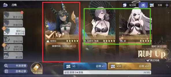 自选UP角色锁定帕特拉(每24天重置一次),至少抽取1个。红色方框为UP角色自选池,绿色方框则为全五星角色每日轮换池,基本上每月会将所有五星角色轮换一遍。(建议可根据需求等待心仪角色轮换到位后再进行抽取。)
