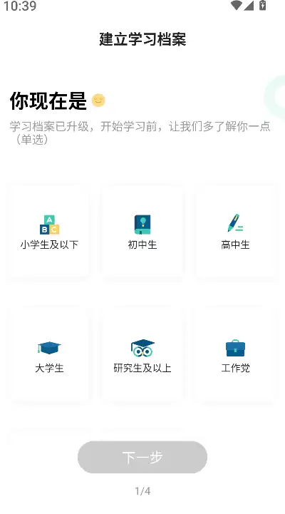 1、软件开启后,第一步请按照提示创建个人学习档案,填写基础信息及学习目标,系统将据此为您定制匹配的学习内容。