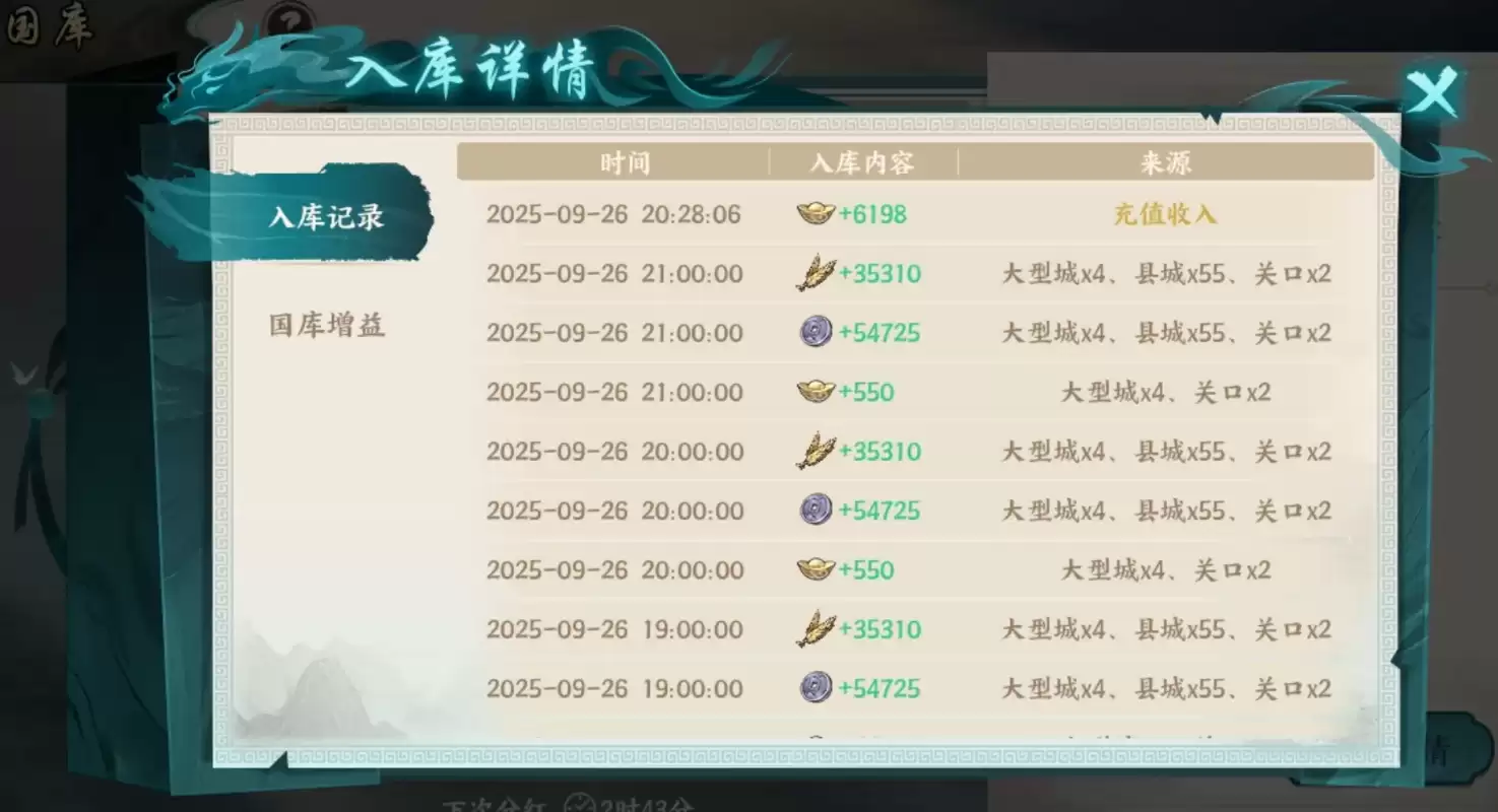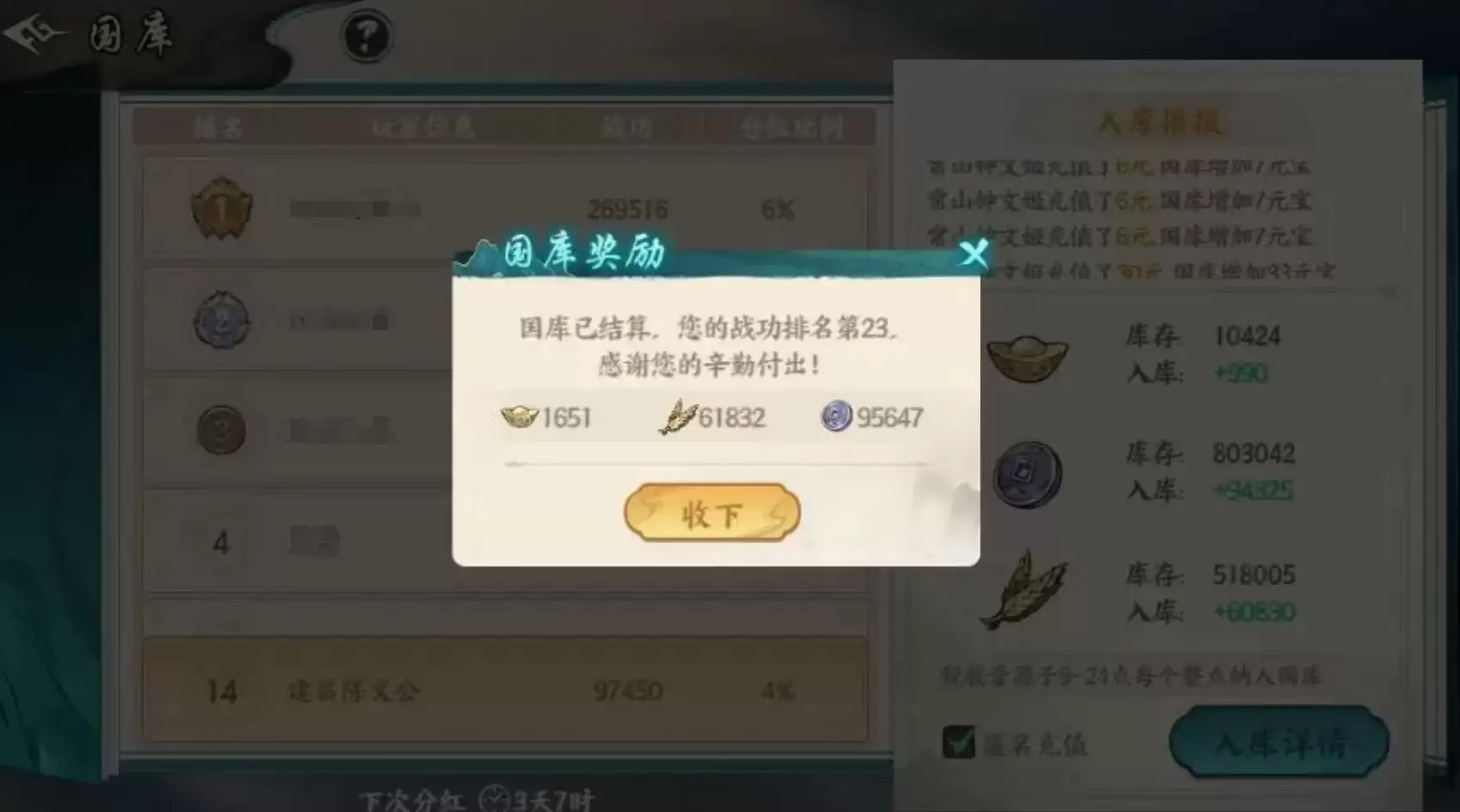 除了个人分红比例,最终你能拿到的资源总量还和国库库存直接相关。国库中储存的物资越多,分红时每位玩家获利的资源就越充足,反之则会大幅缩水。国库库存的增减与玩家在游戏中的多项行为有关:占领大型城池、郡县、关口等战略要地,可提高国库中的粮食与钱币储备,且提升幅度与所占要地的数量呈正比。元宝库存则需要通过玩家充值来累积,只要国家内有玩家氪金,游戏就会按氪金比例将对应数量的元宝注入国库。如需查询各类资源的具体入库情况,可随时查看国库入库明细。