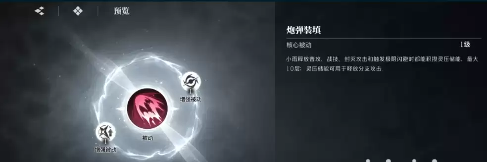 饭室屋雨的核心被动名为“炮弹装填”,这是一个能让她快速积蓄灵压的技能。无论是使用普攻、战技、封禁技,还是进行闪避,都能持续叠加灵压,最高可累积10层。所储存的灵压可用于释放分支攻击,进一步增强输出。此外,她的另外两个被动均为“增强被动”,主要效果是提升灵系伤害,同时降低敌人的攻击与移动速度,需注意该效果仅在敌人进入火焰区域时才会触发。
