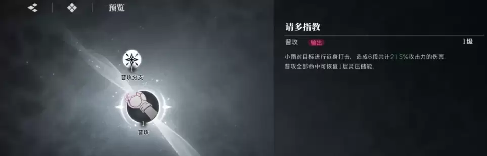 普攻技能“请多指教”是一招近身六段式伤害,全部命中可造成总计215%的伤害。每次命中还能回复1层灵压储能。封禁技则是直接对敌人发射炮弹进行攻击,命中后除了造成伤害外,还会将敌人击飞,并在其脚下生成燃烧区域。若在反击时成功击中敌人,灵压储能更可一次性恢复5层。