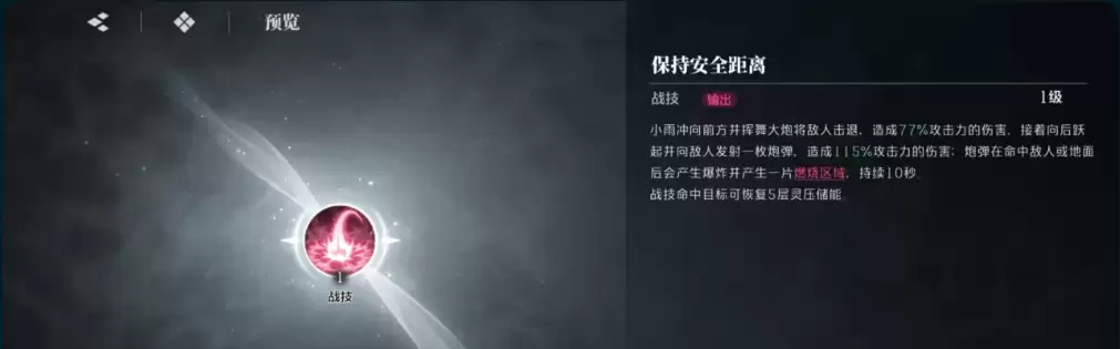 “保持安全距离”是一项兼具输出与位移的战技。发动时,小雨会扛着大炮向前突进,将敌人击退并造成77%的伤害,随后跃起并向敌人所在方向发射一枚炮弹,命中后可造成115%的伤害。炮弹在落地或击中目标后会自动爆炸,形成一片持续燃烧的区域。