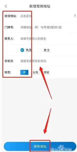 在新增地址页面,完整填写收货地址、门牌信息、收件人姓名、联系电话,并设置便于识别的地址标签,确认无误后点击【保存地址】
