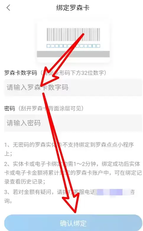 在绑定页面准确输入您的罗森卡数字编号与密码,最后点击"确认绑定"完成操作