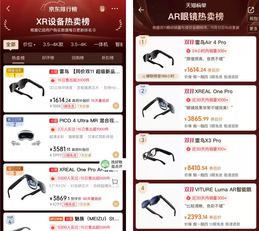 雷鸟创新双11蝉联XR销量冠军,连续四年领跑行业