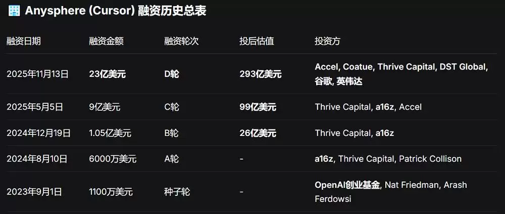 这是Anysphere近一年内完成的第三轮融资,同期估值增长约1026%。2024年12月,Cursor曾完成1.05亿美元的B轮融资,当时投后估值为26亿美元;半年后,Cursor又完成90亿美元的C轮融资,投后估值跃升至990亿美元。Cursor在一年内累计募资超过330.5亿美元。