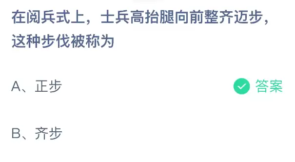 在阅兵式上,士兵们高抬腿整齐向前迈步的步法你知道叫什么吗?支付宝小鸡课堂开课啦!每天花一分钟答题赚饲料,既轻松又有意义,喂养小鸡还能奉献爱心!2025年11月14日蚂蚁庄园小课堂题目正确答案是【正步】,这种步法是军队或其他组织列队行进时使用的,专为展现军威而设计,主要用于阅兵分列式和其他礼仪场合。