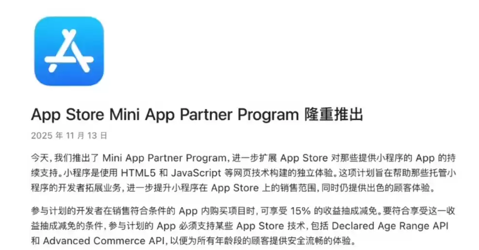 11月14日,苹果公司正式宣布推出小程序合作伙伴计划(Mini Apps Partner Program),旨在进一步支持小程序生态发展,同时为开发者开辟收入增长新路径。参与该计划的开发者,在其符合条件的小程序应用中完成内购交易时,可享受15%的佣金费率优惠(即苹果仅收取15%分成)。