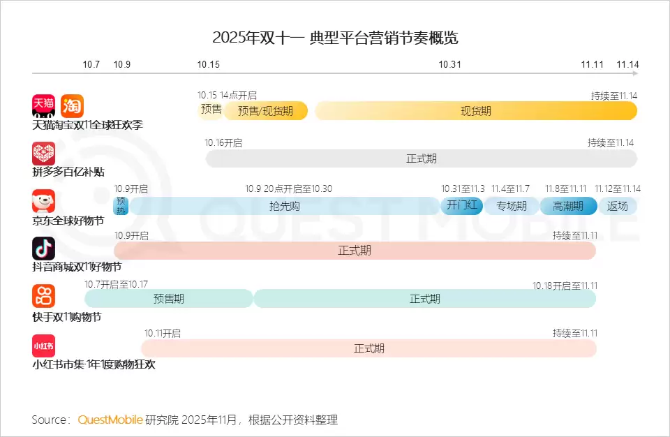 11月14日,QuestMobile发布的最新数据显示,2025年双十一购物节已基本形成电商平台与内容平台各领风骚的市场格局。为了提前锁定消费者,各大平台纷纷拉长促销周期,竞相开启“蓄水战”。快手的“十一长假”还未结束便抢先开启预售,京东和抖音也早在10月9日便点燃战火。值得一提的是,京东今年双十一大促的整体战线已延伸至37天。