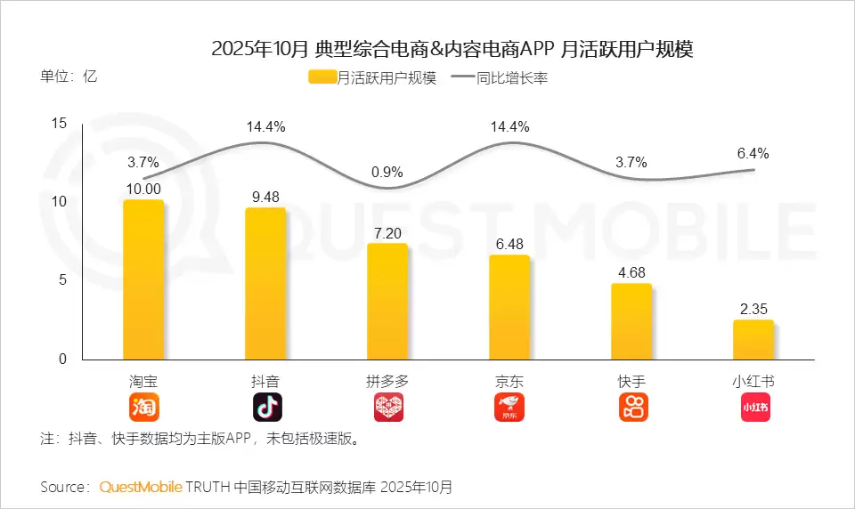 QuestMobile数据显示,2025年10月,淘宝、抖音、拼多多、京东、快手和小红书APP的月活跃用户规模同比增速分别为3.7%、14.4%、0.9%、14.4%、3.7%和6.4%。其用户体量分别达到10.00亿、9.48亿、7.20亿、6.48亿、4.68亿和2.35亿。