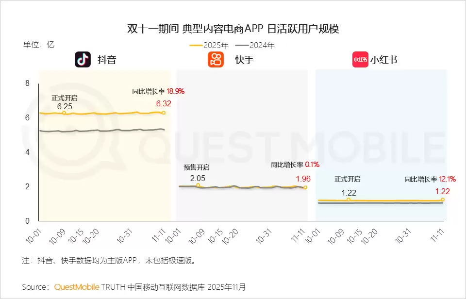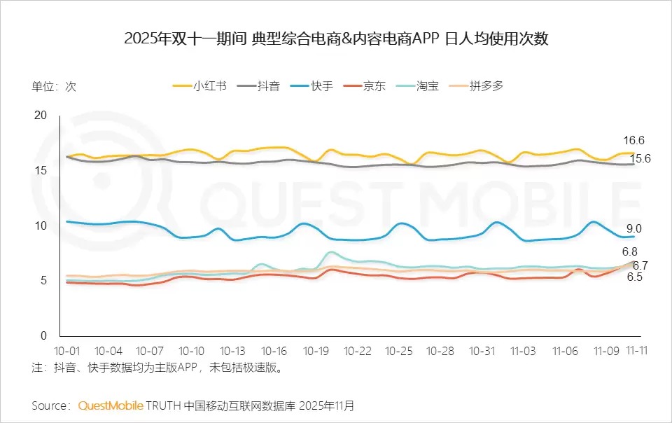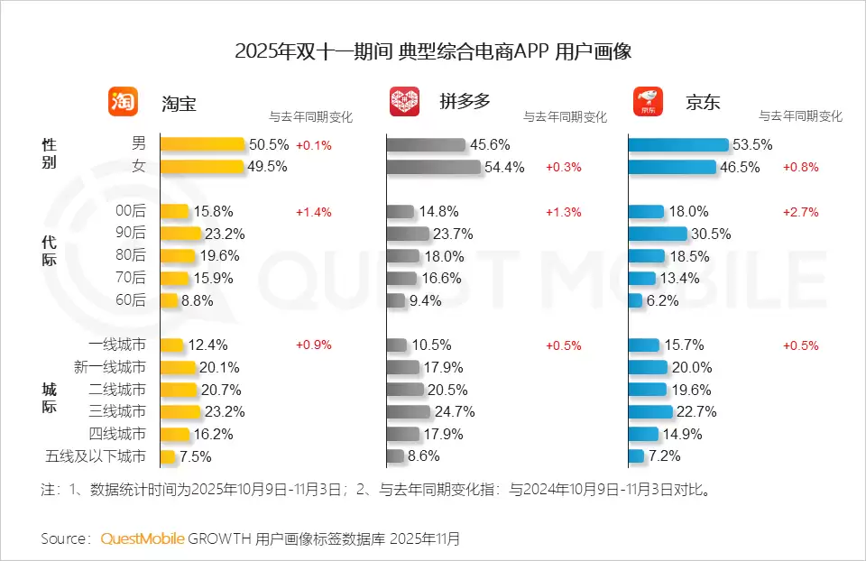 QuestMobile数据显示,2025年11月11日当天,淘宝APP流量同比增长4.2%,达5.08亿;拼多多APP流量同比增长2.5%,达4.14亿;京东APP流量同比增长9.8%,达2.27亿。