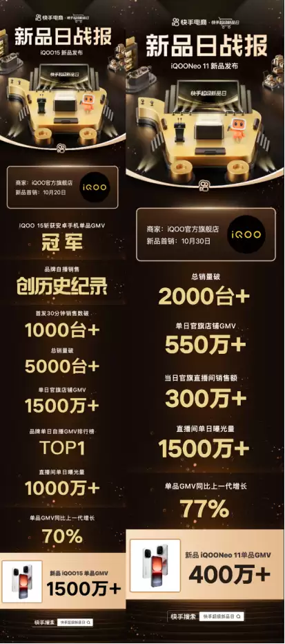 数据显示,10月20日iQOO 15首发当日,新品开售30分钟销量突破千台,新品GMV突破1500万元,较上一代增长70%,斩获安卓手机单品GMV冠军。品牌自播销售额创历史新高,登上品牌单日自播GMV排行榜首位;10月30日iQOO Neo 11首发专场,新品单品GMV突破400万元,同比增长77%,品牌官方旗舰店单日GMV超550万元。