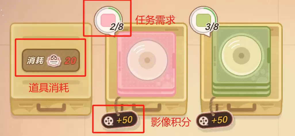 在收纳盒区域,使用「影音标签贴」解锁盒子后,你的任务就是凑齐对应颜色和数量的碟片。每完成一个收纳盒的要求,就能拿到「影像积分」,积累一定数量后即可领取对应阶段的奖励。