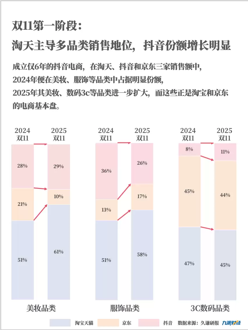 电商行业的“内卷”,本质上是发展阶段演进的必然结果。当市场份额日趋饱和,竞争从增量抢夺转向存量博弈,平台补贴与品牌利润的边界愈发模糊。抖音与淘宝在美妆品类TOP10榜单中重合率高达90%,而抖音在数码3C、运动户外等类目的份额持续扩大,直接冲击传统电商的基本盘。在这种零和博弈的态势下,仅靠低价吸引的用户极易流失,这促使行业重新思考双11的价值定位——它不再只是一场追逐GMV的数字游戏,而是修炼内功、提升效率的练兵场。随着AI技术的深入应用,智能运营与个性化推荐或将成为未来竞争的关键战场。