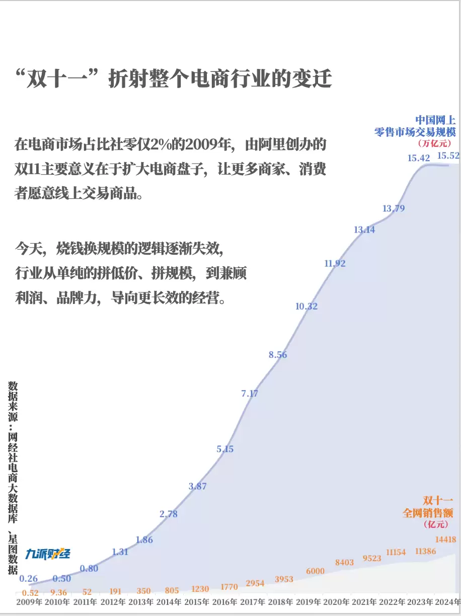 中国电商用17年时间,将双11从一场简单的促销活动,塑造成整个行业的风向标。2009年首届双11仅有27个品牌参与,而到2024年,全网销售额已占网上零售市场的9%,中国网上零售市场规模更是从0.26万亿元飙升至15.52万亿元。然而,当市场增速放缓至0.6%,电商巨头间的竞争却愈发激烈——抖音电商每增长一分销售额,就有半数来自对外部平台的争夺;拼多多通过“百亿补贴”将低价常态化,倒逼整个行业从“大促低价”转向“常年低价”;抖音、快手则凭借“货找人”的内容电商模式,重塑消费链路,持续向美妆、服装等传统电商优势领域渗透。
