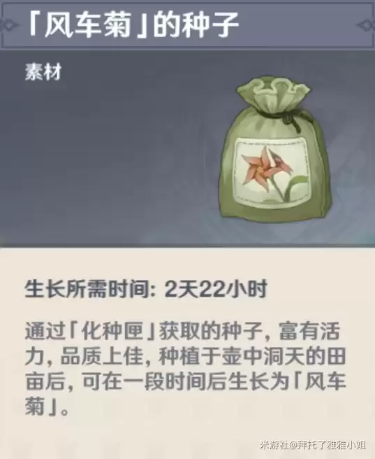 尘歌壶的菜地可以用来种植风车菊,每块田地最多可种8朵,经过70小时生长后即可成熟收获。种子可以从小圆处购买,或者装备化种匣采集风车菊时获得。