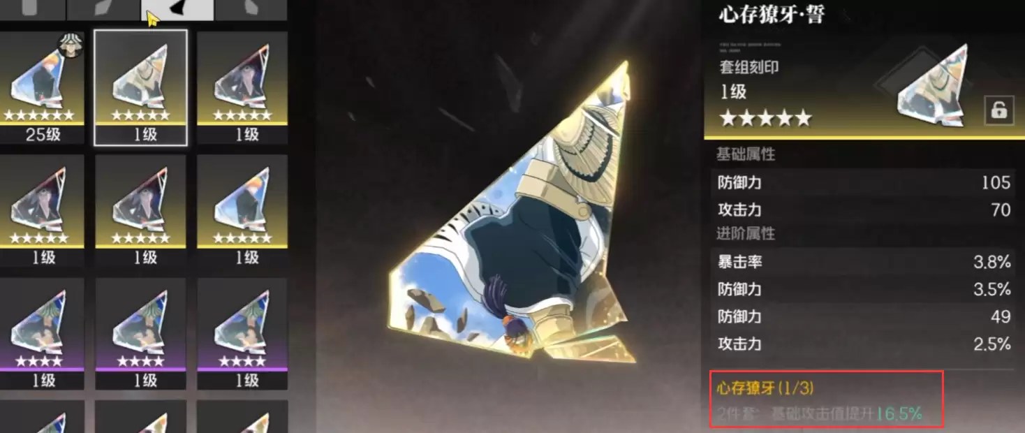坦克型角色需要注重生存能力和反击效果,搭配防御型套装"扼守钟勇",可以保障前排的生存空间。同时,针对一些拥有特殊机制的角色单位,在攻击时可触发反击状态,或在封印以及闪避期间,能够触发特殊效果的,则需要配备上金色的专属装备。