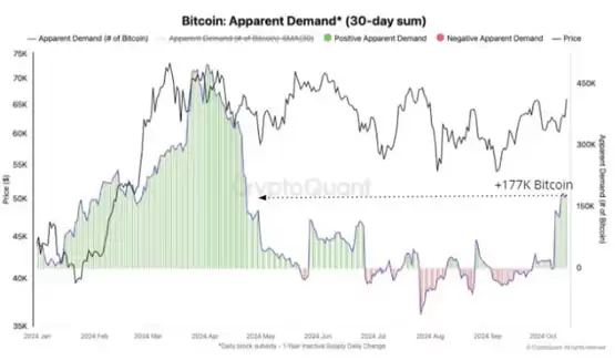 根据 CryptoQuant 分享的图表,比特币在上一轮牛市和今年早些时候刷新历史高价之前,都曾出现需求激增的迹象。
