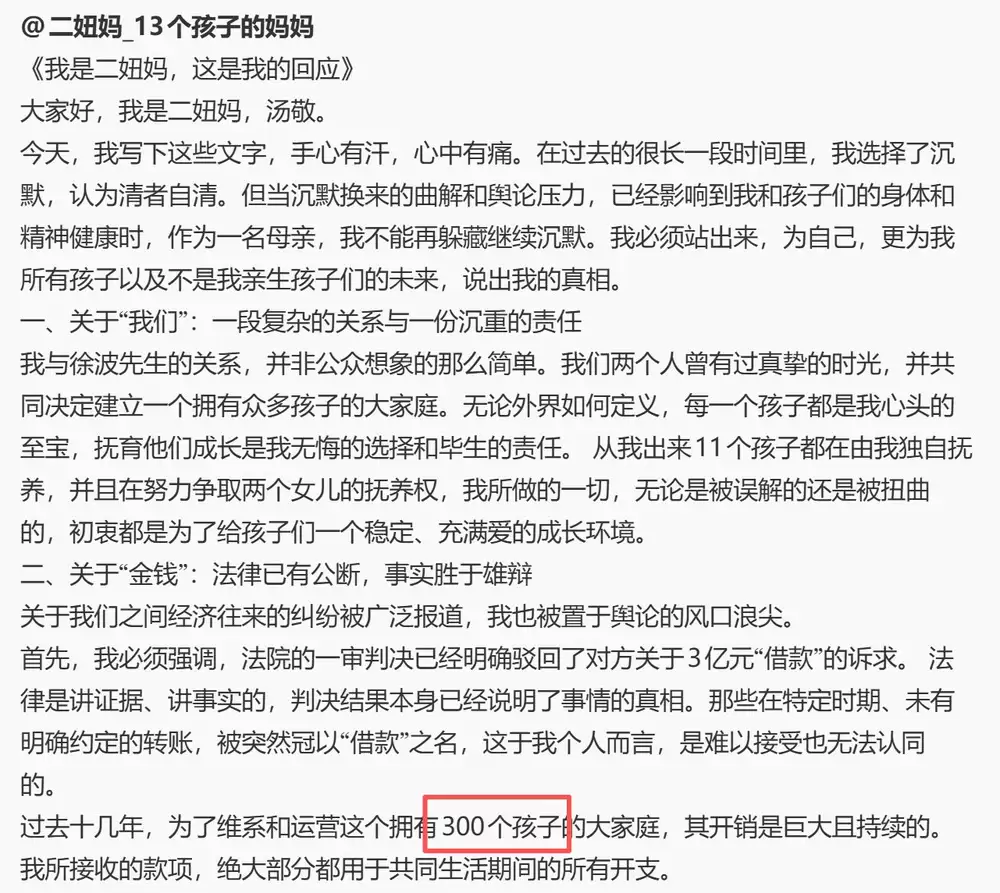微博账号"二妞妈_13个孩子的妈妈"在文中透露,她与徐波共同育有11个子女,目前她正在争取两个女儿的抚养权。她声称其中一个女儿"二妞"曾遭到囚禁和殴打,从13岁至今一直没有上过学。她还表示,过去十几年间,为了维系和运营这个拥有300个孩子的大家庭,开支巨大且持续不断……